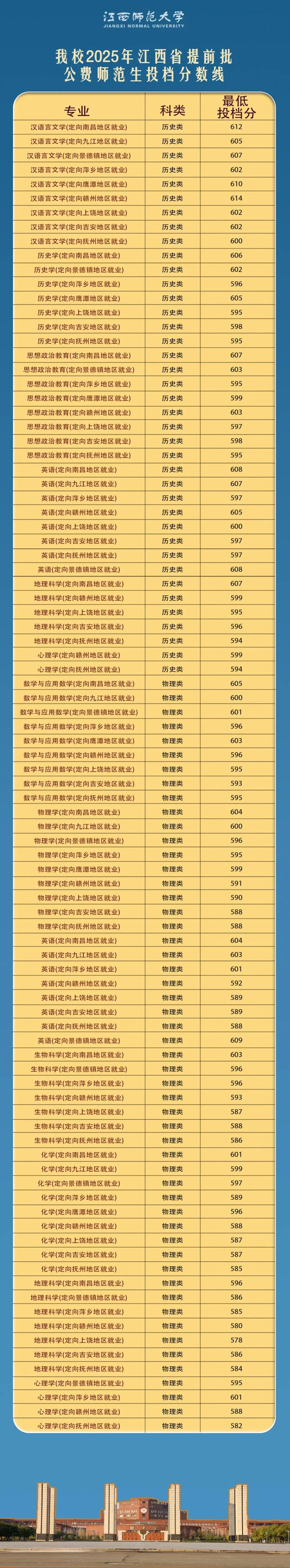 江西师范大学2025年江西省提前批公费师范生投档分数线公布