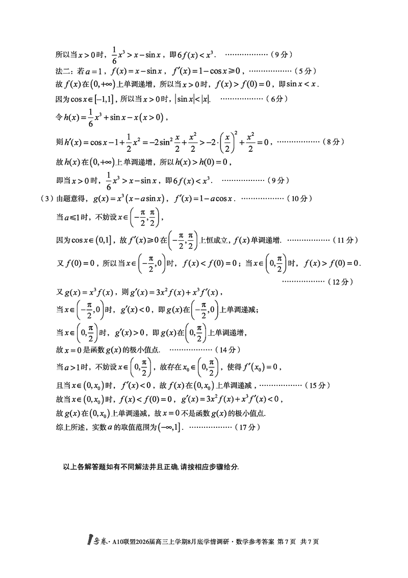 安徽省1号卷·A10联盟2026届高三上学期8月底学情调研数学试题及答案