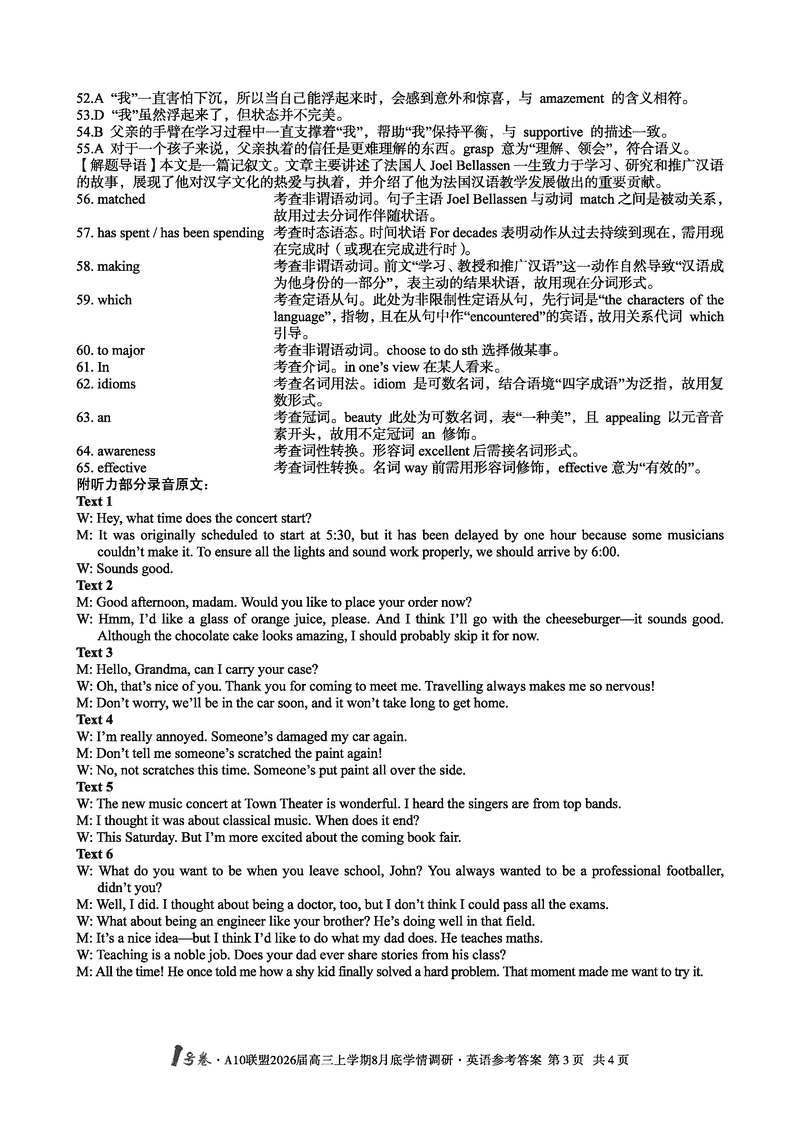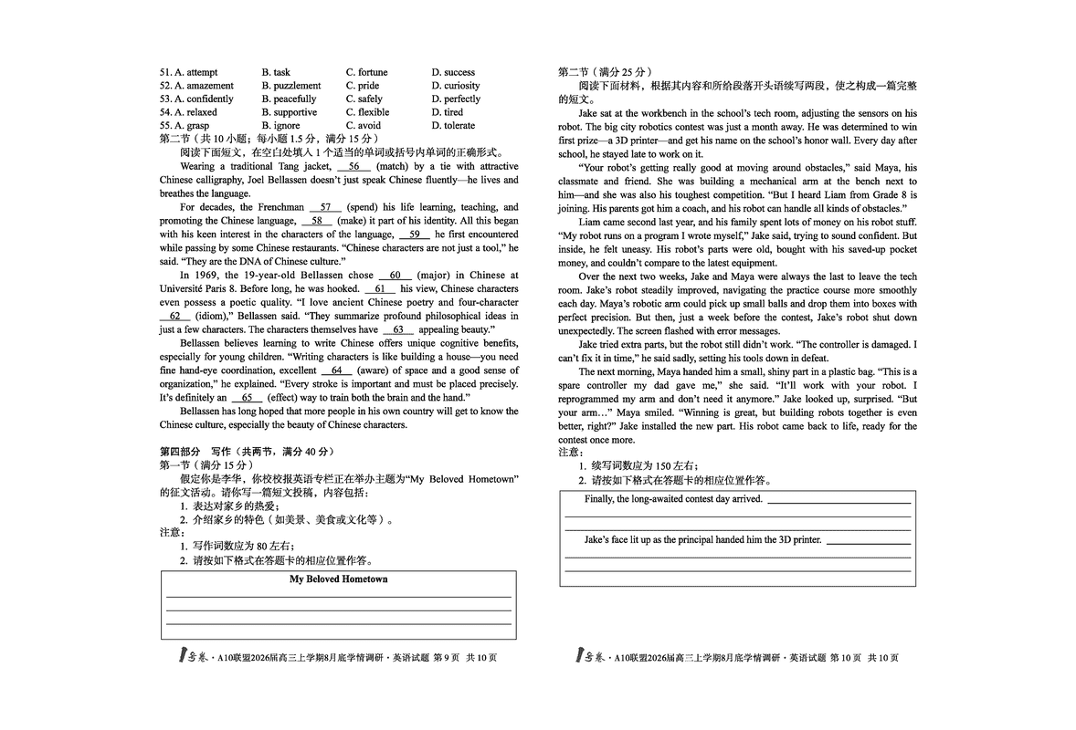 安徽省1号卷·A10联盟2026届高三上学期8月底学情调研英语试题及答案
