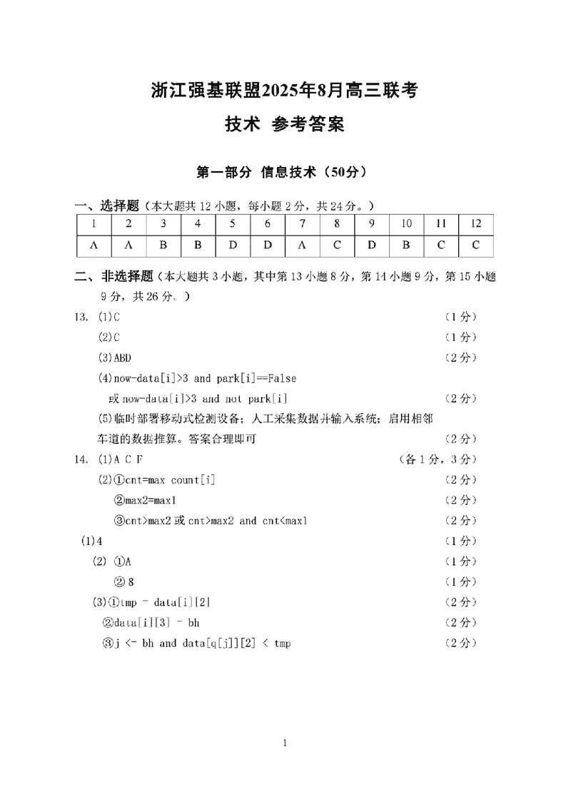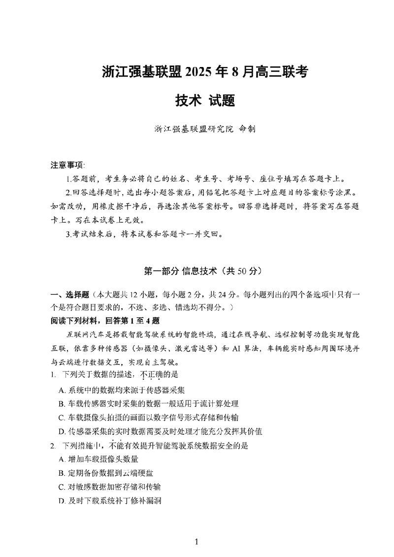 浙江强基联盟2025年8月高三联考技术试题及答案 时间:2025-08-30 浙江 理综试题 浙江强基联盟2025年8月高三联考技术考试已于近日开考,为方便考生考后及时查看考试情况,查漏补缺、弥补不足,本文整理了试题答案解析相关信息! 汇总:浙江强基联盟2025年8月高三联考 技术试题及答案解析