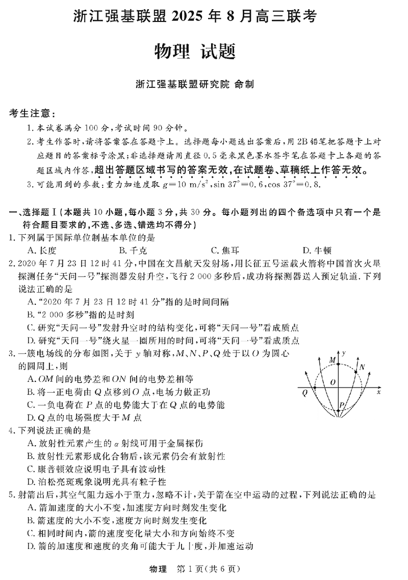 浙江强基联盟2025年8月高三联考物理试题及答案