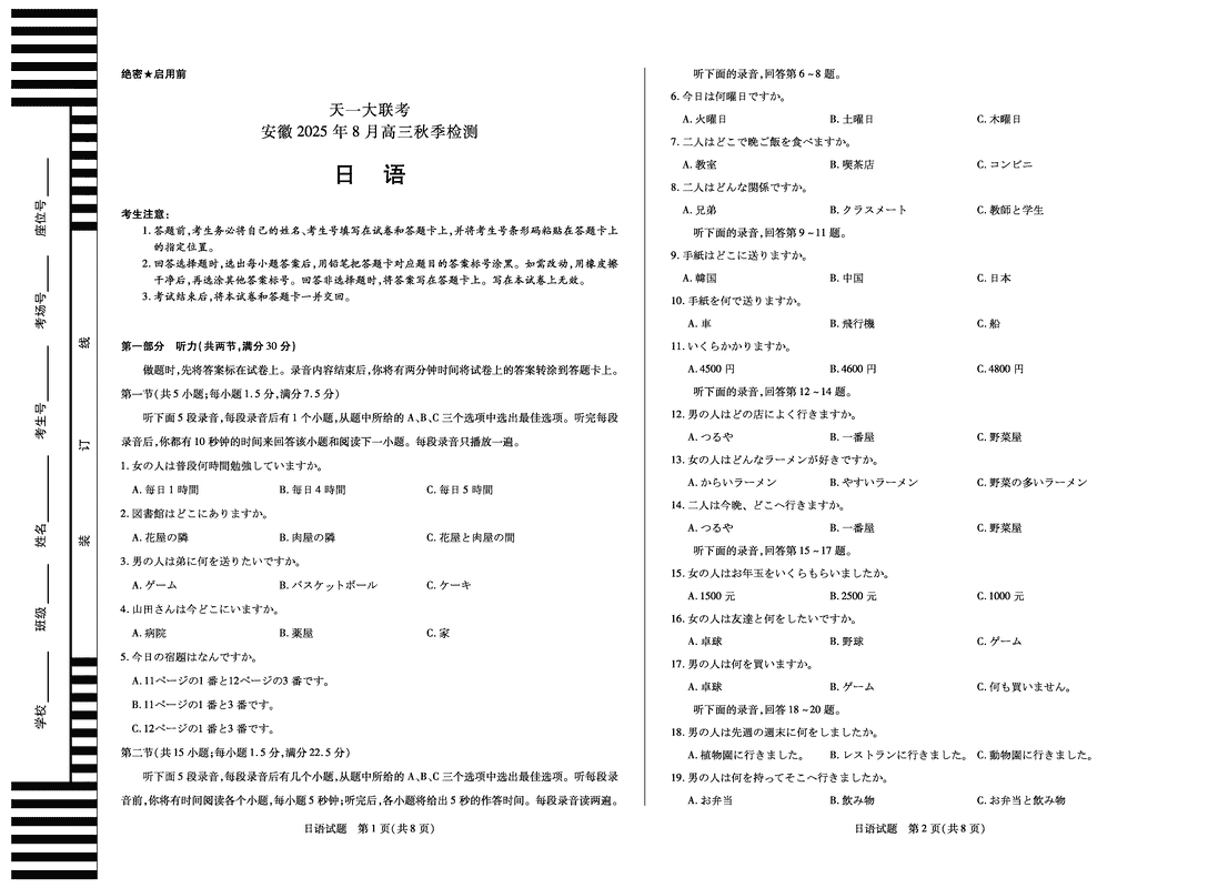 安徽天一大联考2026届高三8月秋季检测日语试题及答案