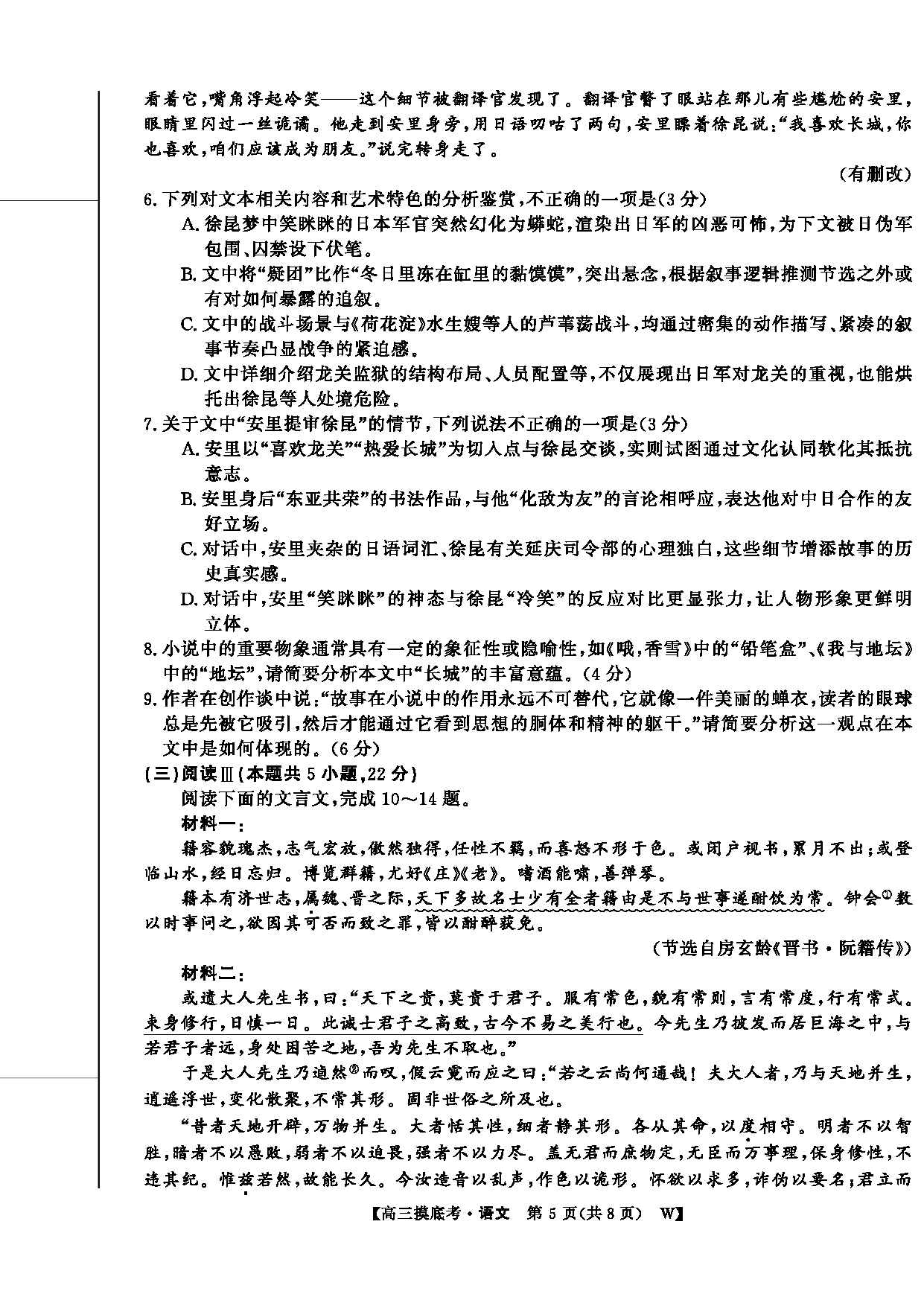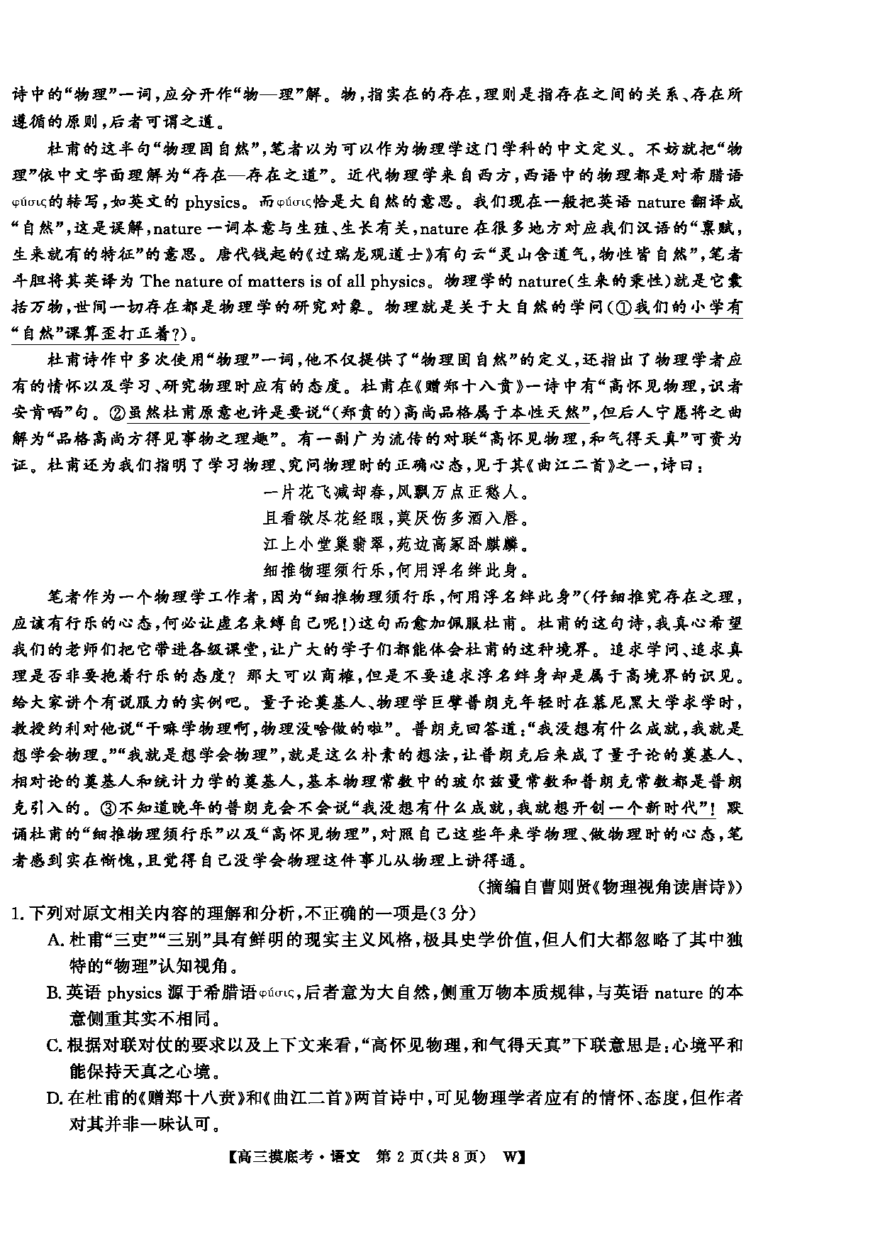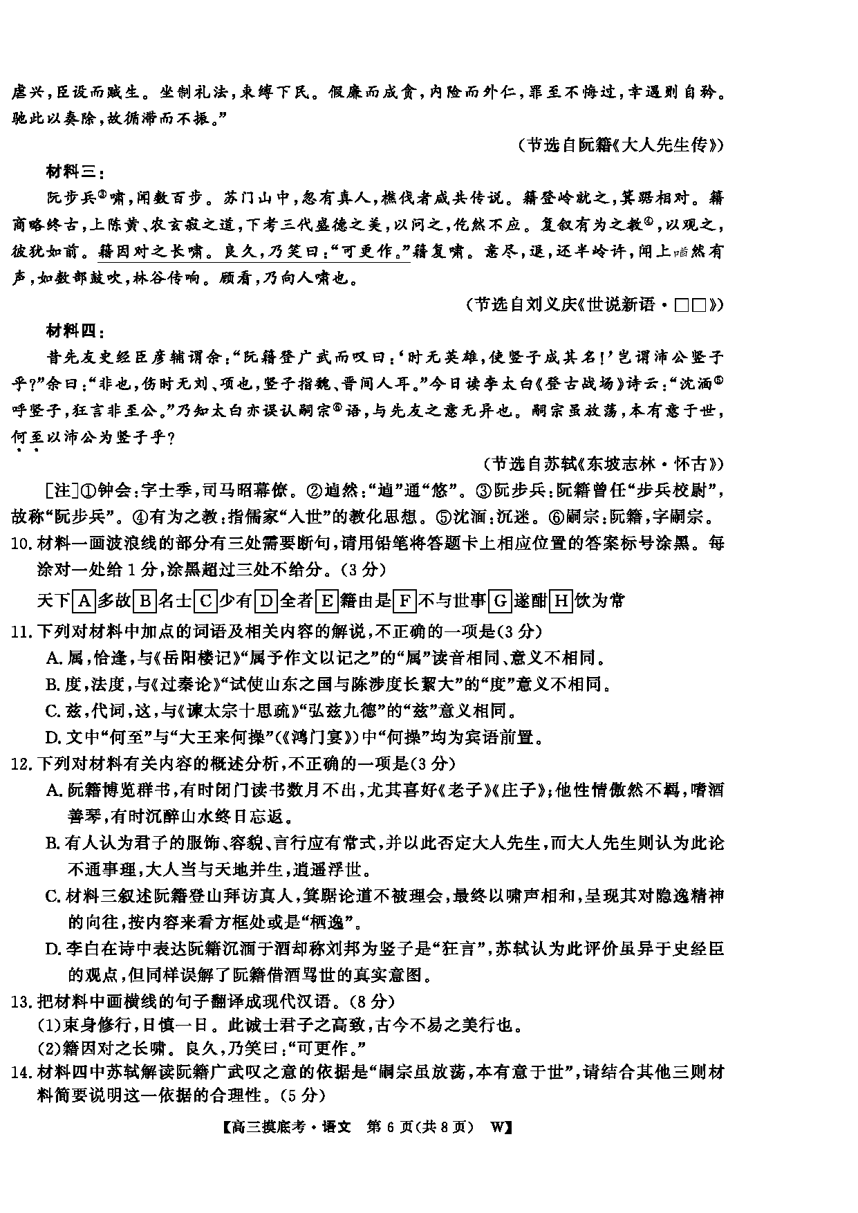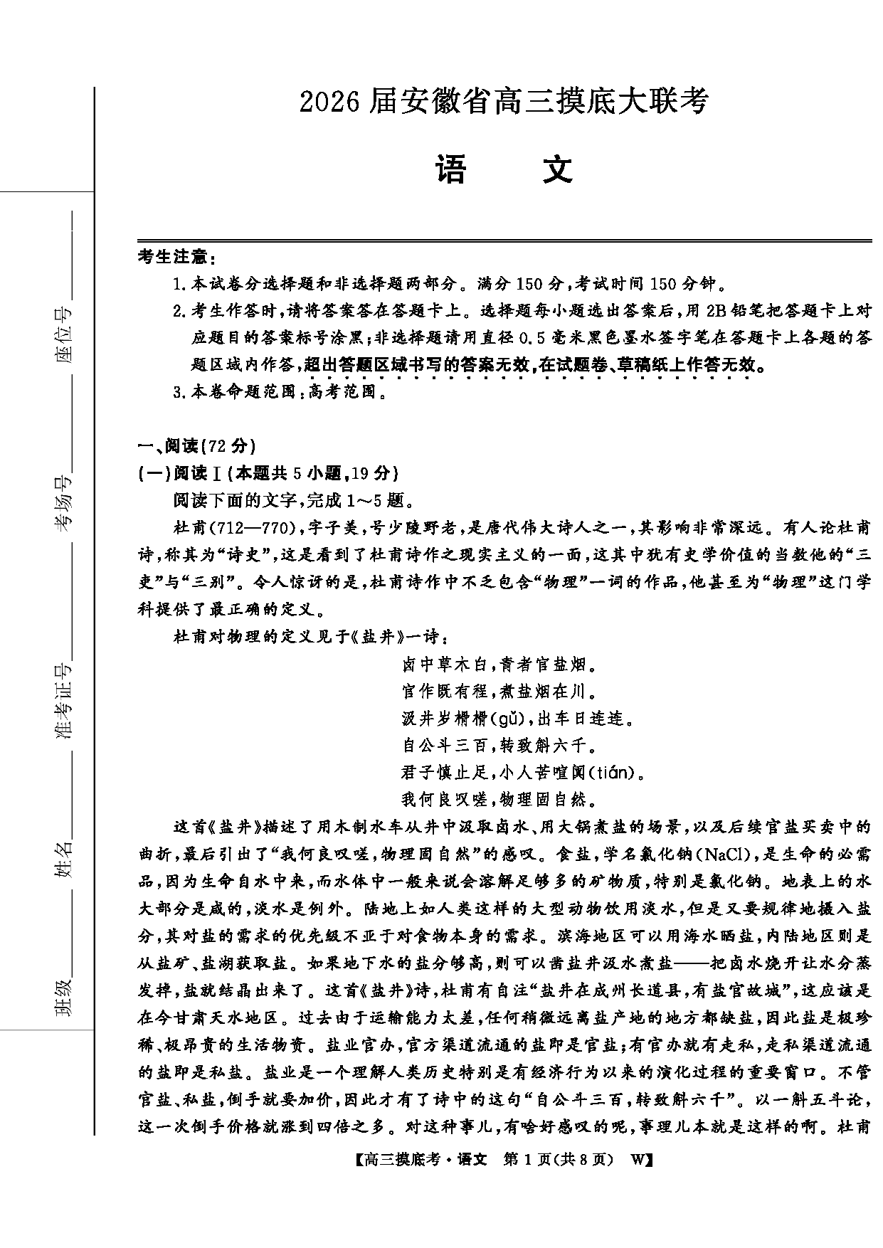皖南八校2026届高三上学期8月摸底大联考语文试题及答案