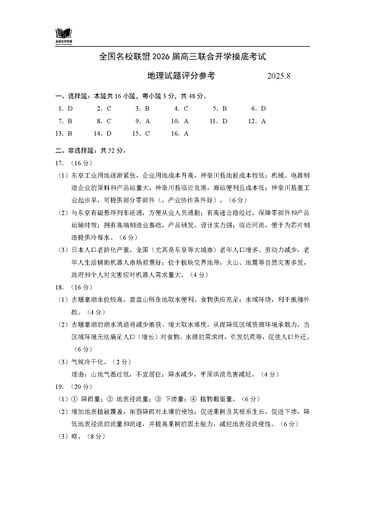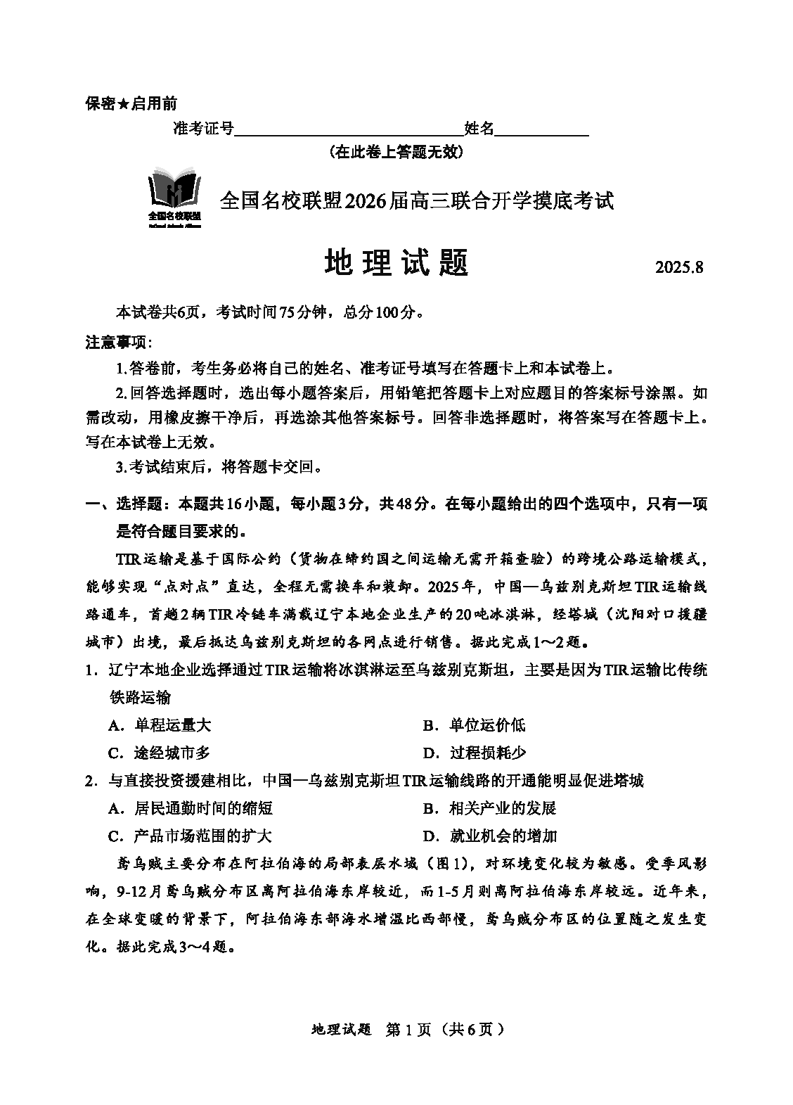 内蒙古-全国名校联盟2026届高三联合开学摸底地理试题及答案
