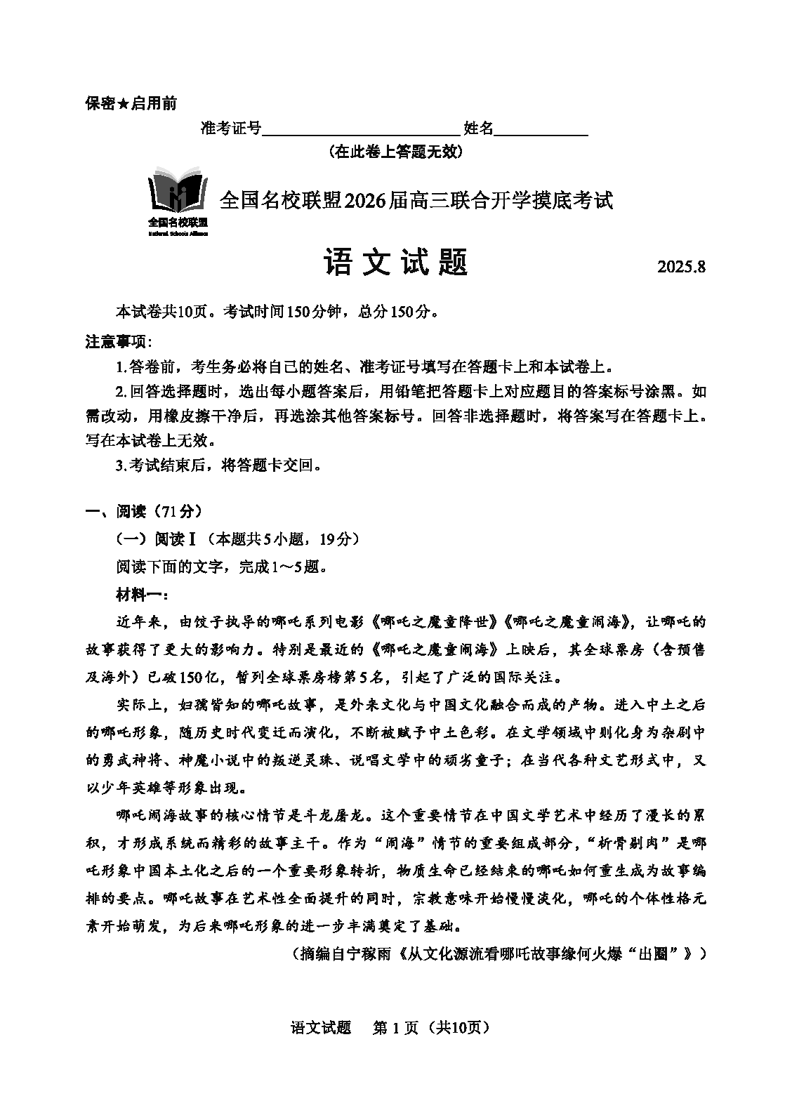 内蒙古-全国名校联盟2026届高三联合开学摸底语文试题及答案