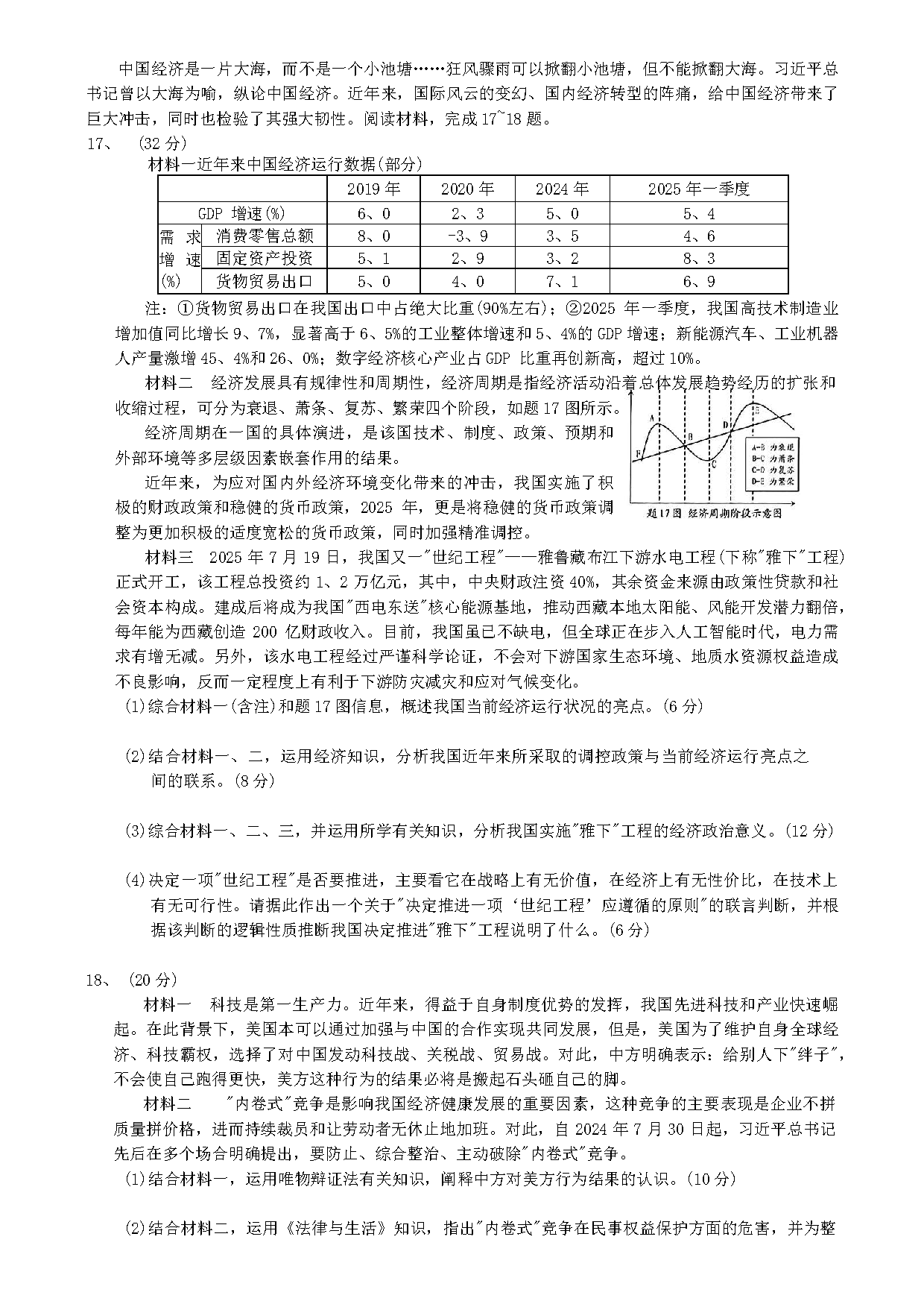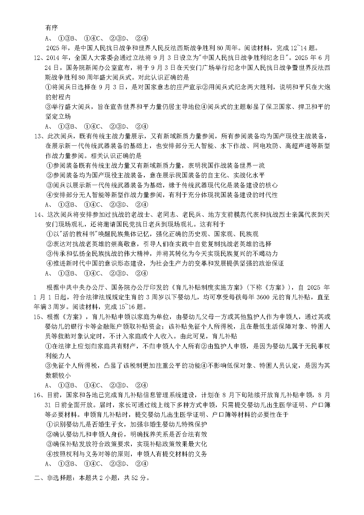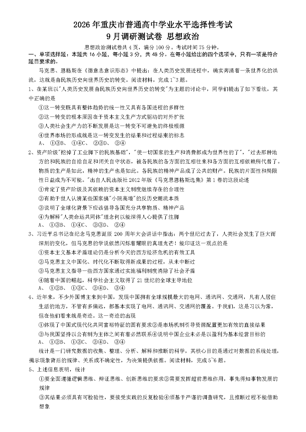 重庆康德卷2026年高三上学期9月调研政治试题及答案