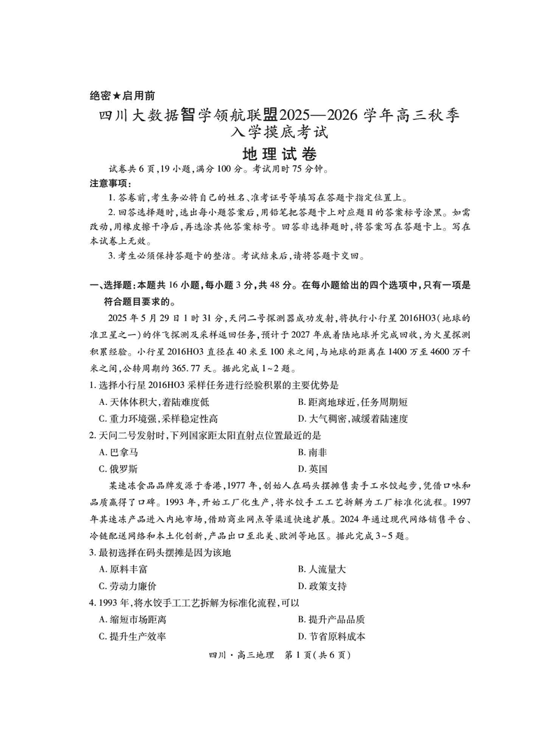 四川大数据智学领航联盟2025-2026学年高三秋入学摸底考地理试题及答案