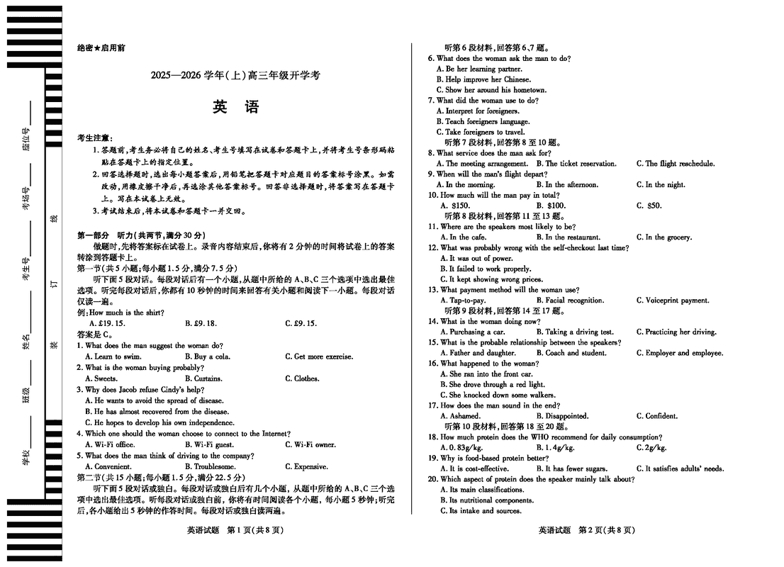 河南天一大联考2025-2026学年高三上学期开学考英语考试已于近日开考,为方便考生考后及时查看考试情况,查漏补缺、弥补不足,本文整理了试题答案解析相关信息!