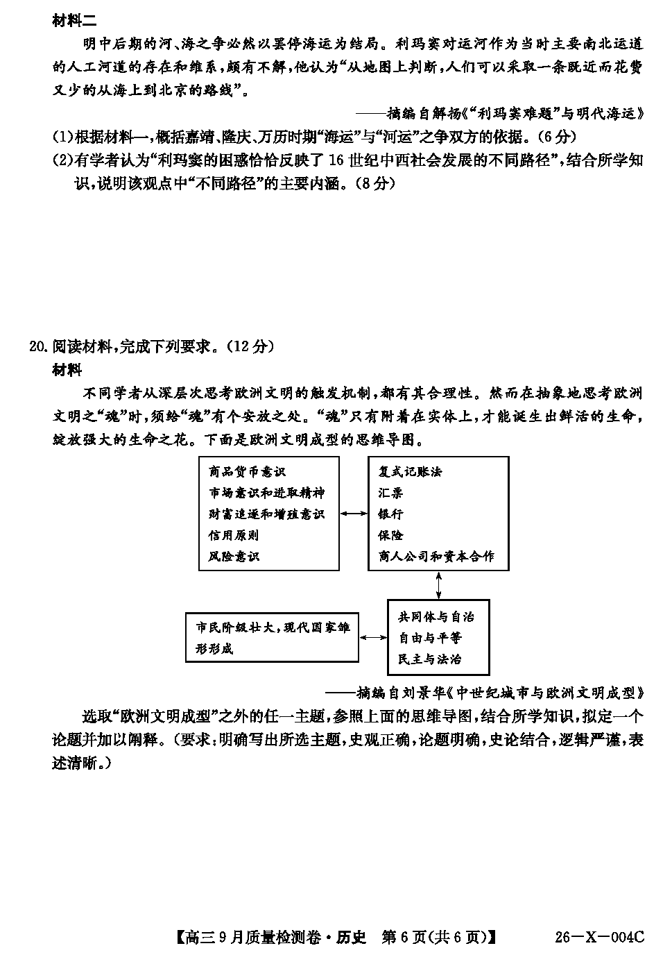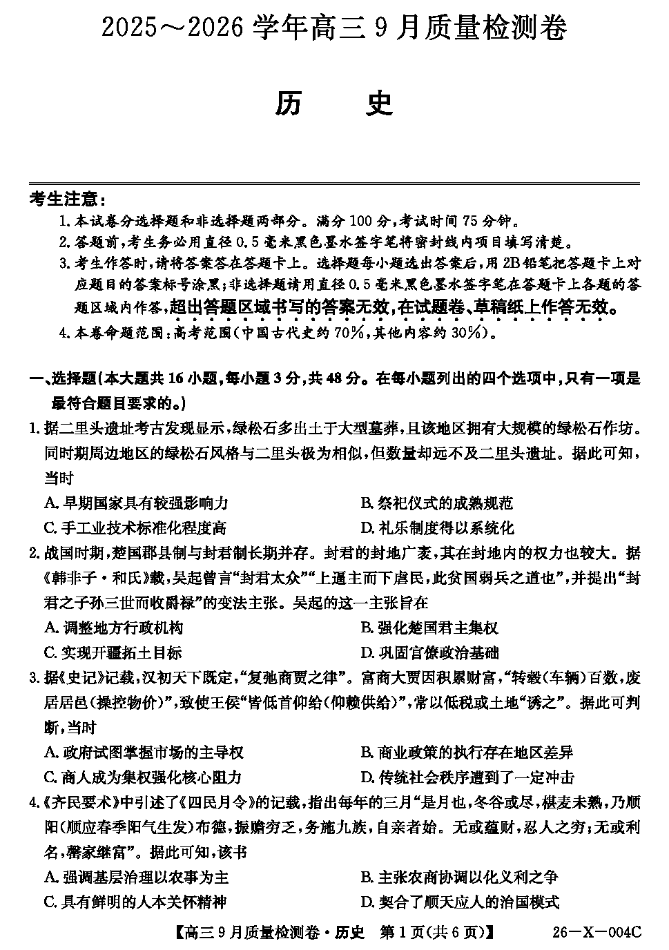 山西三晋卓越联盟2025-2026学年高三9月质检历史试题及答案