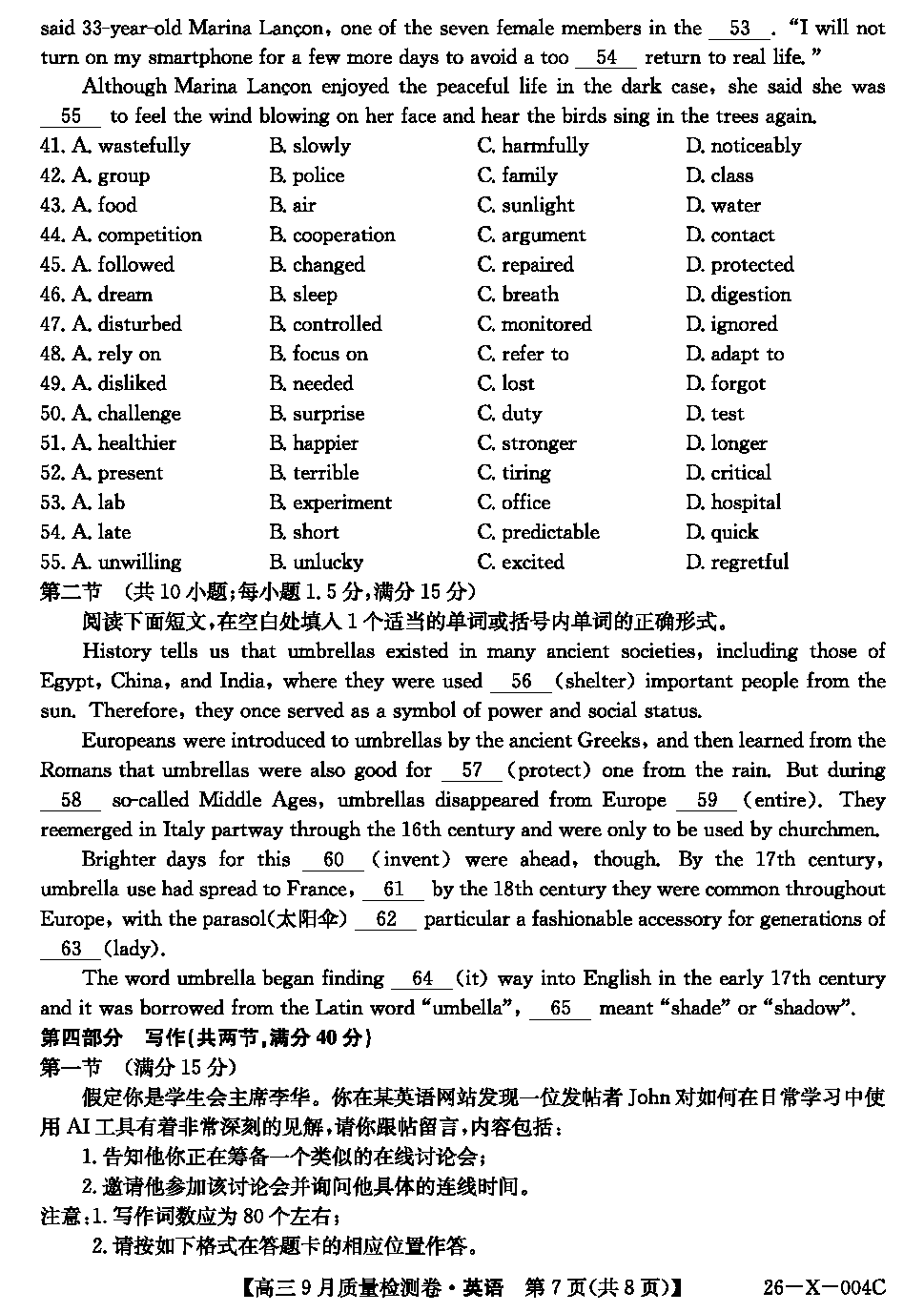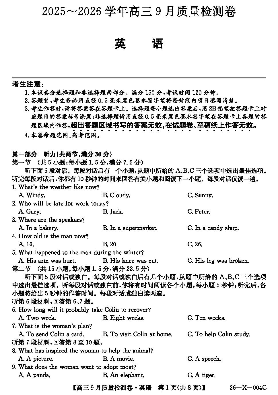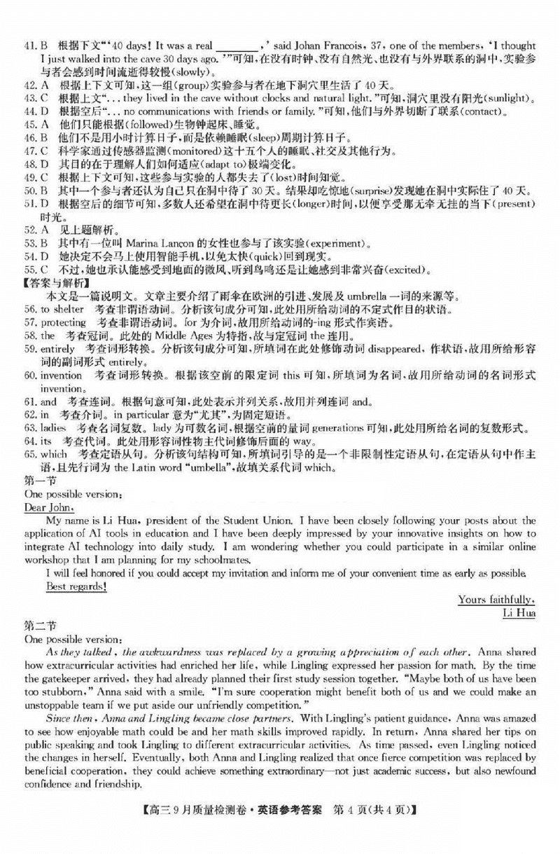 山西三晋卓越联盟2025-2026学年高三9月质检英语试题及答案