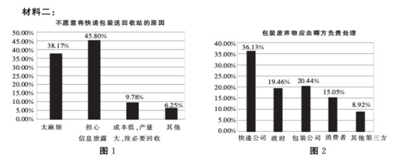 B.根据材料二图1可知,大家不愿意将快递包装送回收站的原因主要集中在两点:一是害怕自己的信息 遭到泄漏,二是认为将其送回收站太麻烦。