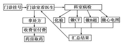 【解析】 按照就医流程,先门诊挂号,然后去门诊室看医生,根据医生叮嘱,去科室病检,等到汇总结果,反馈给医生,再按照医生叮嘱,交费直至药房取药。尤其注意科室病检的流程。不遗漏任何环节。另外注意字数要求。
