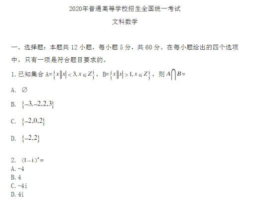 2020内蒙古高考文科数学试题【Word真题试卷】