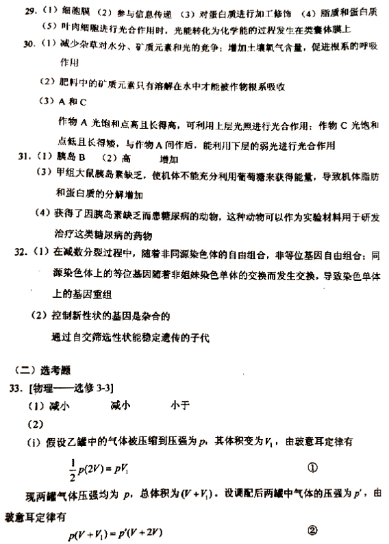 (2)(10分)甲、乙两个储气罐储存有同种气体(可视为理想气体)。甲罐的容积为V,罐中气体的压强为p;乙罐的容积为2V,罐中气体的压强为1/2p。现通过连接两罐的细管把甲罐中的部分气体调配到乙罐中去,两罐中气体温度相同且在调配过程中保持不变,调配后两罐中气体的压强相等。求调配后