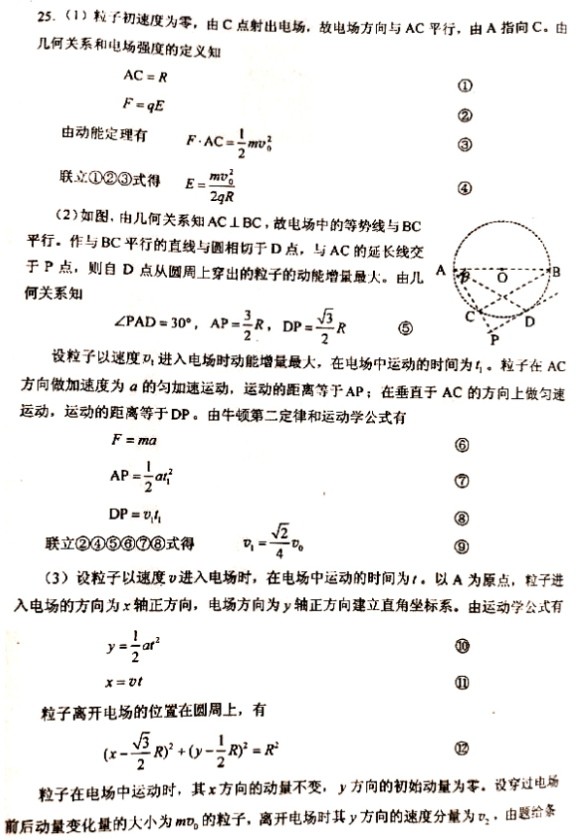 在一柱形区域内有匀强电场,柱的横截面积是以O为圆心,半径为R的圆,AB为圆的直径,如图所示。质量为m,电荷量为q(q>0)的带电粒子在纸面内自A点先后以不同的速度进入电场,速度方向与电场的方向垂直。已知刚进入电场时速度为零的粒子,自圆周上的C点以速率v0穿出电场,AC与AB的夹角θ=60°。运动中粒子仅受电场力作用。