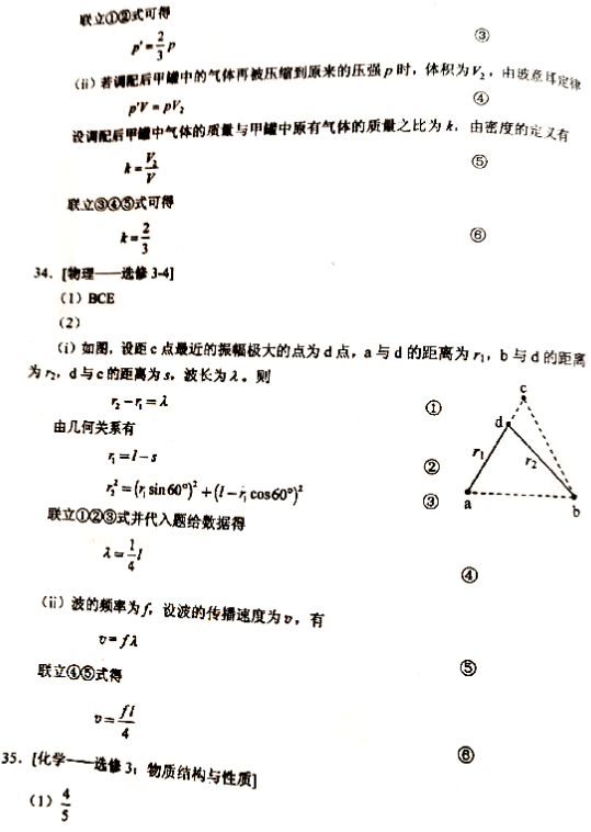 (2)(10分)一振动片以频率f做简谐振动时,固定在振动片上的两根细杆同步周期性地触动水面上a、b两点,两波源发出的波在水面上形成稳定的干涉图样。c是水面上的一点,a、b、c间的距离均为l,如图所示。已知除c点外,在ac连线上还有其他振幅极大的点,其中距c最近的点到c的距离为3/8l。求: