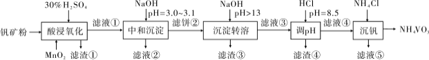 钒具有广泛用途。黏土钒矿中,钒以+3、+4、+5价的化合物存在,还包括钾、镁的铝硅酸盐,以及SiO2、Fe3O4。采用以下工艺流程可由黏土钒矿制备NH4VO3。