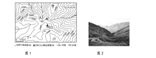 我国某山脉主峰由古老的片麻岩构成,第四纪冰期时该地雪线高度为海拔3500~360米。图1为该主峰附近地形图,图2为图1中某地的谷地景观图。完成17、18题。