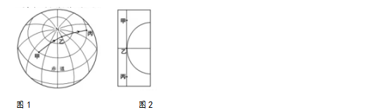 图1为某飞机在甲、乙、丙间沿地球大圆周飞行轨迹示意图。图2为飞机飞到乙地时,其垂直下方所示的经线、纬线和晨昏线位置关系图,此时丙地地方时为17点。完成19、20题。