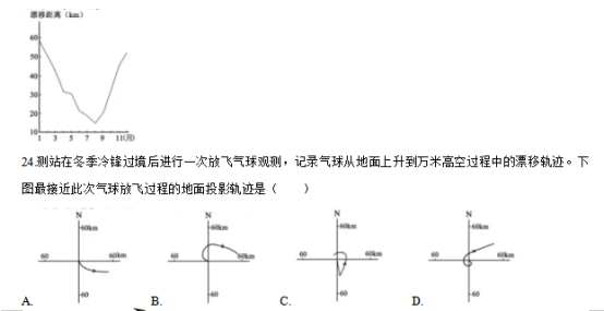在中纬度地区五千至一万米高空盛行着波状的西风气流。我国华北某气象测站放飞探空气球进行大气观测,并记录气球从地面上升到万米高空时与气象测站之间水平漂移距离,下图为多年平均水平漂移距离统计图。完成24、25题。