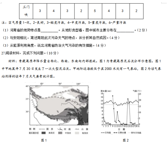 (2)青藏高原泥石流高发区相对集中分布在高原的__________部。从气候角度,分析甲地此次泥石流形成的原因。(5分)