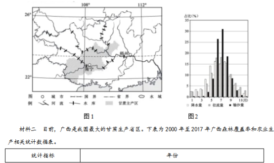 材料一 西江梧州站多年平均径流量居全国第二位;多年平均输沙量5570万吨/年,居全国第三位。随着西部大开发的实施,2017年梧州站输沙量减少至2500万吨/年。图1为广西境内西江流域主要水库和甘蔗主产区分布示意图。图2为梧州站径流量、输沙量及南宁市降水量年内占比统计图。